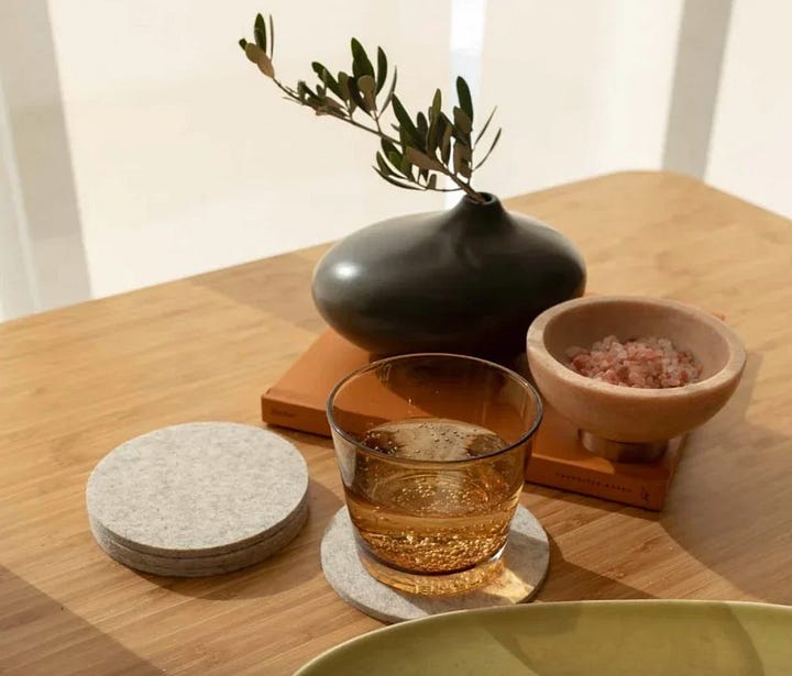 Absorbent felt is a good landing pad for glassware with condensation, and these coasters will work well in my new study (I already have a set in Brooklyn).