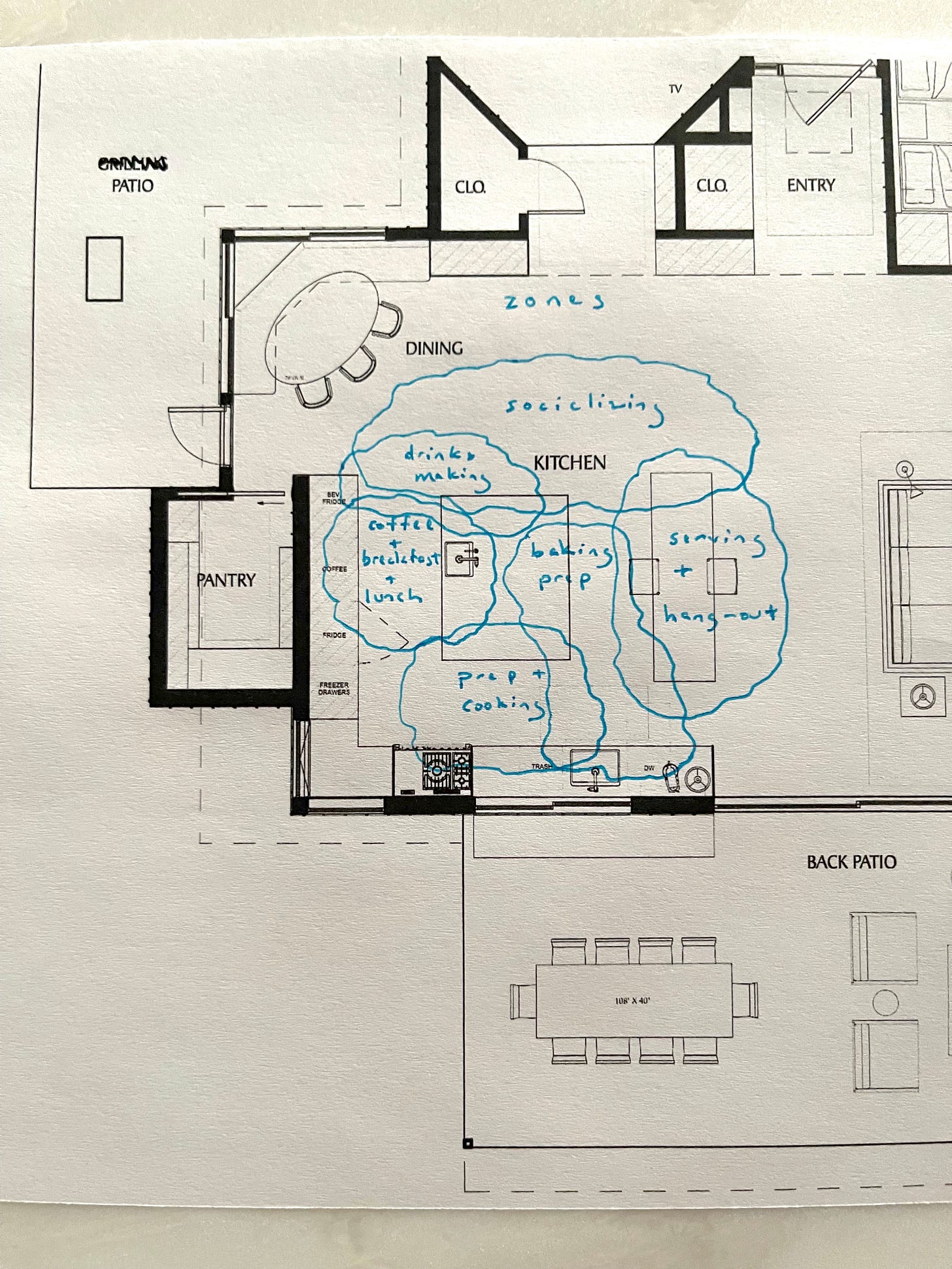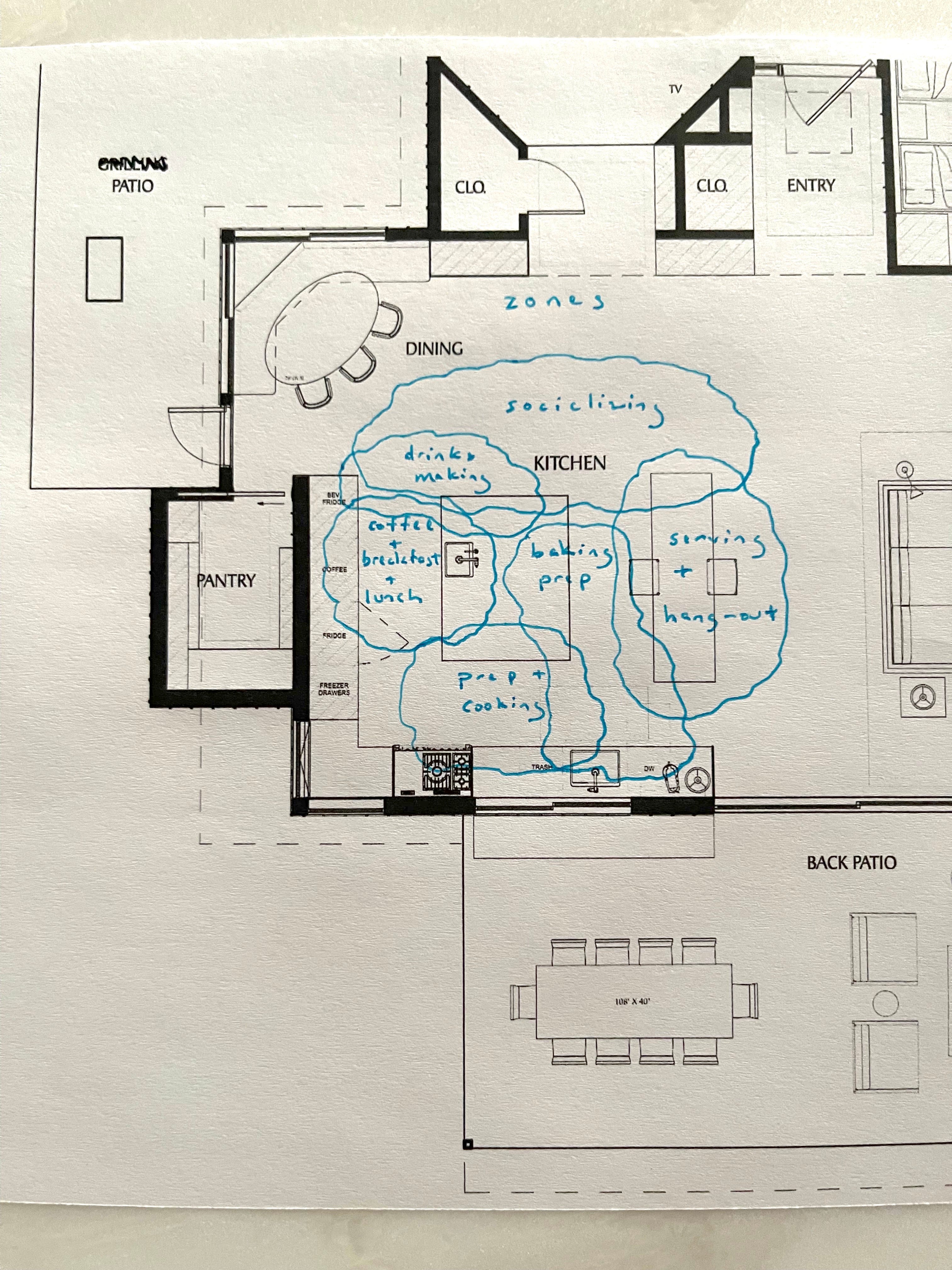 Next it was time to drill down into how the kitchen would be used and how it would function best. You’ll make yourself crazy if you try to think of every scenario, so I aimed for a handful of our most common uses and identified the areas, or “zones,” where they’d take place.